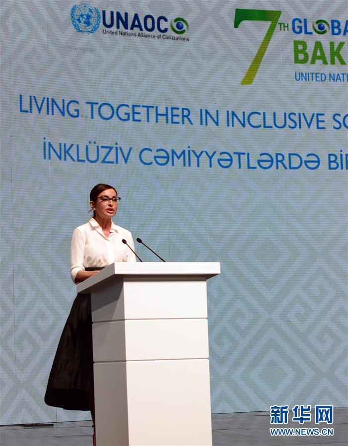 这是阿利耶娃在阿塞拜疆首都巴库举行的论坛上发言的资料照片(2016年4月27日摄)。 新华社发(巴巴耶夫摄)