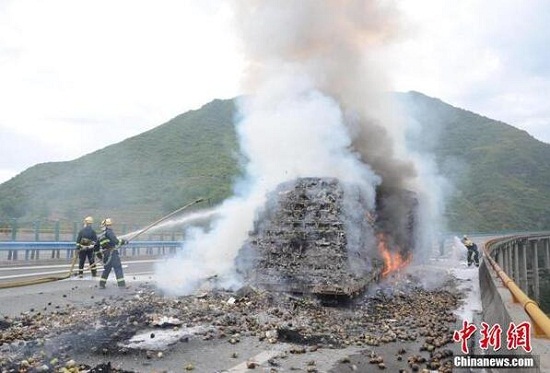 5月18日上午7时许,一辆载有30吨梨子的货车在行至福银高速十漫段郧西县上津镇收费站附近时突然起火。当地消防紧急灭火,但因包装梨子的纸箱助燃了火势,30吨梨子全部烧毁,货车也基本报废。火灾未造成人员伤亡。范时瑞 摄