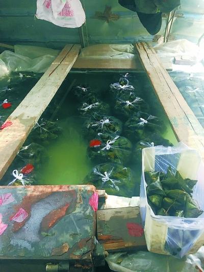 大棚的尽头并排放置着四个蜂窝煤炉子,上面的大锅里正蒸着粽子。大棚里有六只金属大桶和两个用水泥砌的池子,池子里灌满了水,所有蒸熟的粽子都会在这里完成最后一道工序流程——冷却。每个池子里都泡着几十包已经蒸好的粽子,水看着非常浑浊不清。