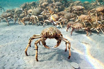 数量庞大的蜘蛛蟹一只挨着一只,有的甚至还叠在一起,望不到头。它们浩浩荡荡的向前迁徙,壮观无比。希尔表示,蟹群要进入浅水区蜕皮,而这一时期它们很容易受到海豹、鸟类和海豚之类的捕食者的攻击,所以它们就会成群结队的一起行动来保护自己。