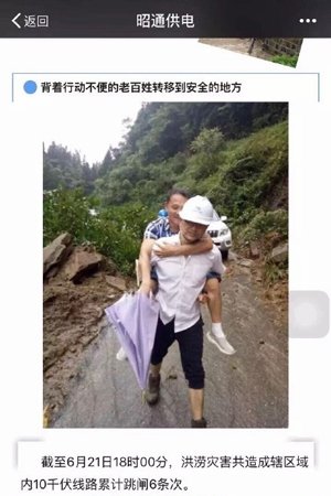 6月21日晚9点14分,云南电网有限责任公司昭通供电局在其微信公众平台“昭通供电”中,发布了一则题为“灾情就是命令,彝良多地山洪肆掠,彝良供电公司紧急响应”的抗洪救灾报道。报道中,配有一张照片,图说为“电力公司员工背着行动不便的老百姓转移到安全地方”。