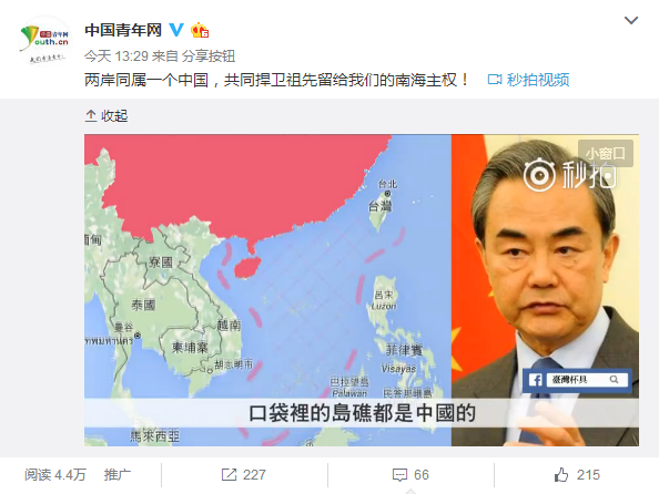 在这段名为《Taiwan Beiju——一次让你看懂南海主权争议》的短视频中,一位台湾青年以讲故事的形式描述了南海问题的始末,不仅条理清晰而且有理有据,由浅入深地表达出南海自古以来就是中国领土,如果中国大陆失去了南海主权,同样台湾也会失去东沙群岛,因此大陆和台湾应当联起手来,共同捍卫中国主权。