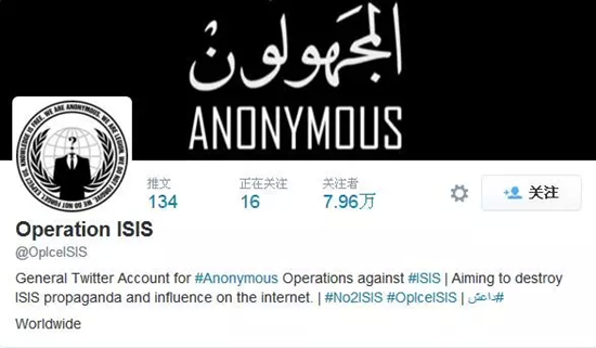 国际知名黑客组织“匿名者”(Anonymous)曾发起#OpISIS行动,攻陷了数百个ISIS的Twitter和Facebook帐号。去年巴黎恐袭发生后,匿名者又向ISIS全面宣战。“我们将攻陷你们的网站、帐号、E-mail,并将你们身份曝光。从现在开始网络上不会再有你们的安身之处,你们会像病毒一样被我们杀掉。”除了ISIS,匿名者的目标还有那些资助和支持ISIS的组织。