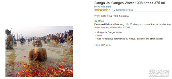 在亚马逊和Snapdeal等电商网站上,恒河水标价……印度媒体说挺便宜,看着这黄黄的一瓶……我不想评价。