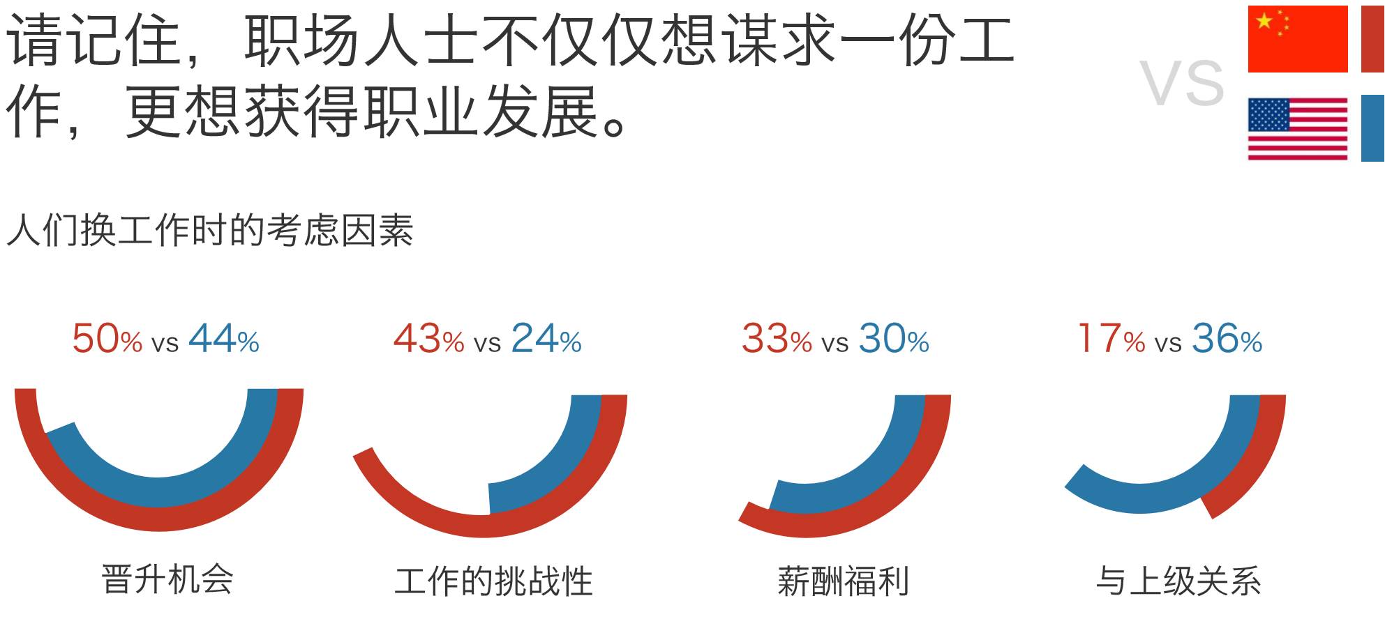 更具挑战性的工作和职业发展机会能够吸引中国职场人士去寻找新的工作机会。相比而言,北美职场人士则更关心公司前景是否稳定,与同事关系是否融洽。因此一定要告诉中国的求职者,为什么招聘企业和工作职位会有快速的发展。