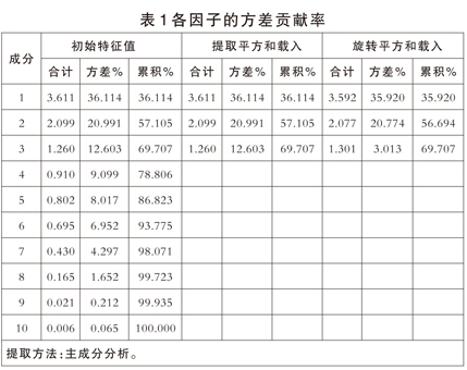 由表1可以清楚看到,因子分析共萃取出3个因子,第一个因子(R)的特征根值为3.611,解释原有指标总方差的36.114%;第二 个因子(S)的特征根值为2.099,解释原有指标总方差的20.991%;第三个因子(C)的特征根值为1.260,解释原有指标总方差的 12.603%;三个因子共解释了原有指标总方差的69.707%。