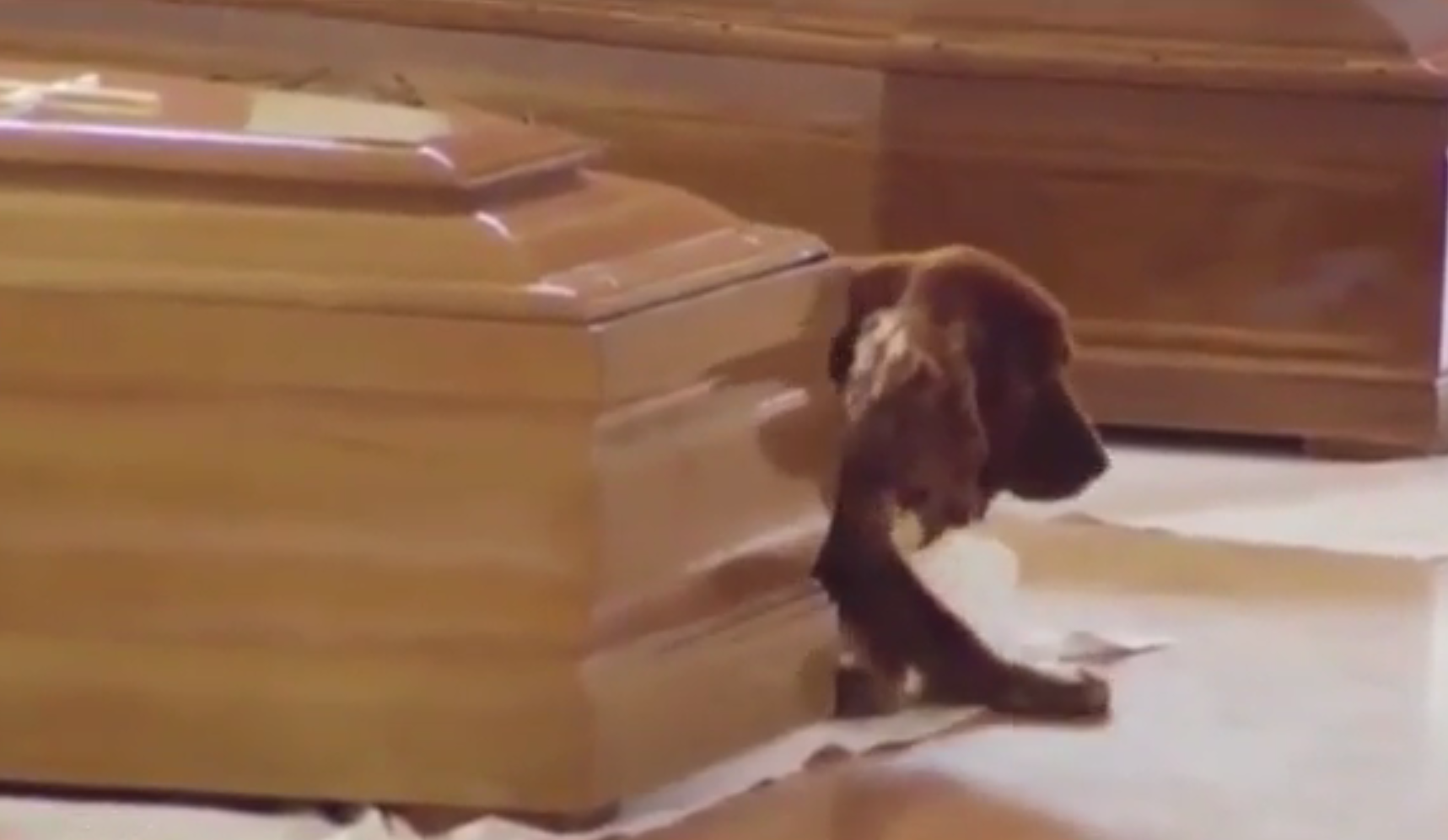 在葬礼的另一边,有一只金色西班牙猎犬拒绝离开主人的灵柩旁边,它依依不舍主人的样子让人心碎。