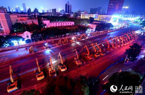 据人民网8月27日报道,8月26日22时28分,随着一阵鞭炮声的响起,近百台挖掘机发出隆隆的敲击声,顿时,烟尘四起,服役了24年的南昌市永和门立交桥一点点被“侵蚀”,从高空俯瞰,拆除现场颇为壮观。