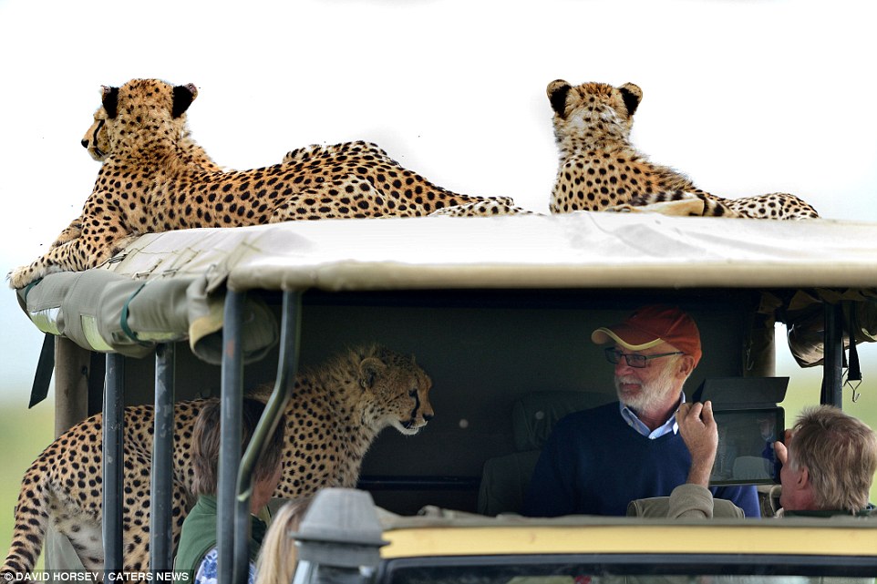 该照片摄于2015年7月,肯尼亚西南部的马赛马拉野生动物保护区。这位戴帽子的游客名为Mickey McCaldin,来自爱尔兰,当时,猎豹离他的距离只有30厘米。