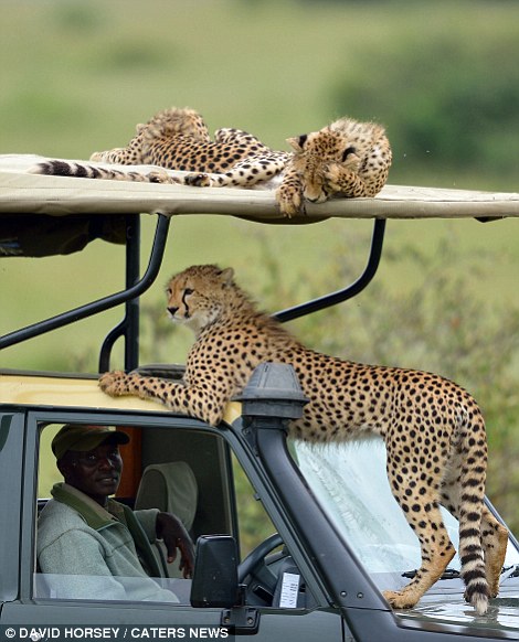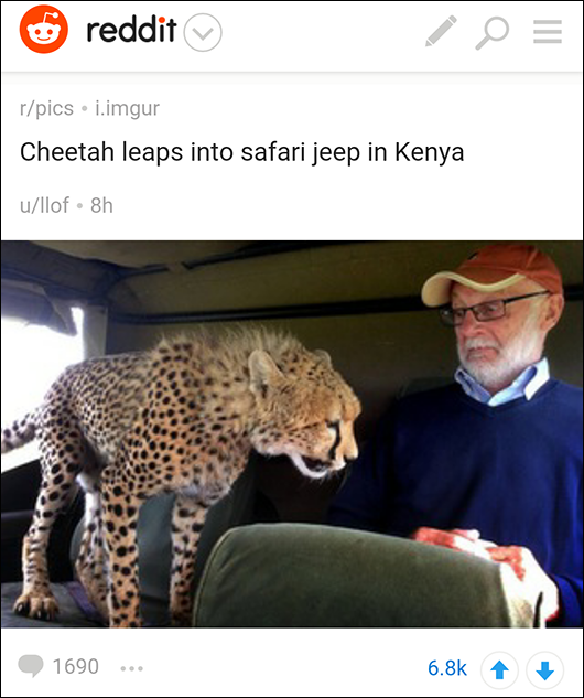 9日,一网友在reddit论坛上po出一张照片:肯尼亚,一只猎豹钻进吉普车,车中乘客一脸惊愕。
