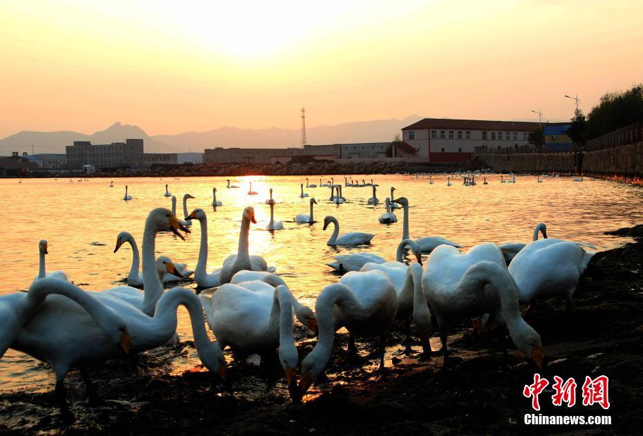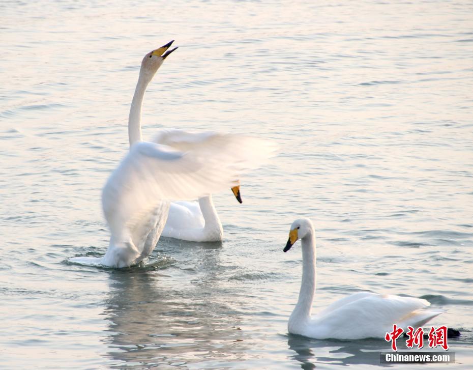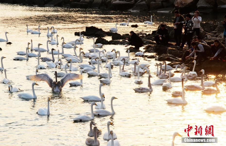 11月2日,在山东省荣成市烟墩角港湾拍摄的大天鹅。自10月27日山东省荣成市迎来首批70只“回家”大天鹅以来,每天都有大批大天鹅迁徙大军,从西北利亚、蒙古等地飞抵山东荣成大天鹅国家级自然保护区的十多处湖泊港湾栖息越冬。目前已迎来2000多只大天鹅,预计本月将有上万只大天鹅陆续飞来。据了解,从上世纪80年代开始,山东荣成市民就自发开展 “留住大天鹅”志愿活动。30多年来,参与活动的市民和游客达上百万人次,人与天鹅实现零距离的接触。上万只大天鹅也把荣成当做栖息越冬的第二家乡,每年十月份准时归来,翌年春天回迁。荣成赏天鹅已成为荣成市冬季旅游的亮丽名片。 中新社发 林海珍 摄 图片来源:CNSPHOTO