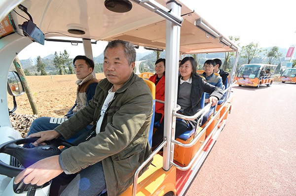 11月28日,退伍军人、村民汪显平开着电瓶车带着游客观光。汪显平今年8月通过抓阄的方式,投入12万元,获得了两辆电瓶观光车的经营权。据悉,园区目前有20辆类似的电瓶观光车。