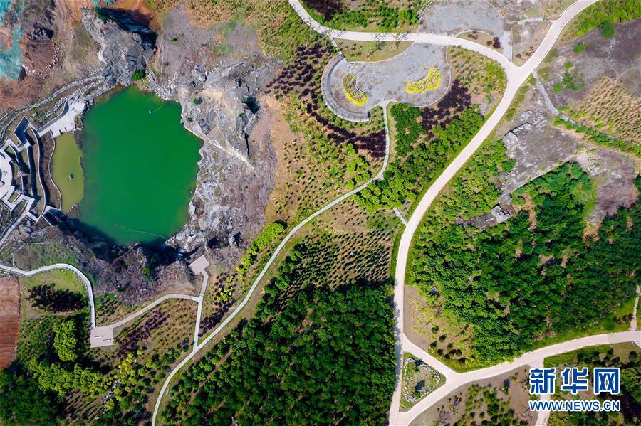 5月9日航拍的生态逐步修复后的济南市卧牛山地质公园。山东省济南市卧牛山盛产名为“济南青”的岩石,由于长期过度开采,山体一度严重破损。