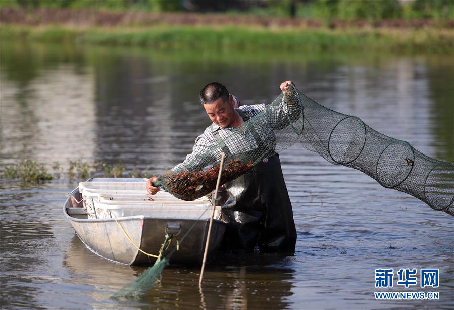 6月7日,两位农民在湖南南县明康龙虾养殖专业合作社的稻田边将收上来的小龙虾装箱。十多天后这片稻田将开始种植水稻,而没被收走的小龙虾将游入稻田边上的水沟里继续繁殖,繁殖出的虾苗第二年将回到水田生长。近日,位于洞庭湖区的湖南南县的稻田里一片繁忙景象,当地农民正赶在种植水稻前抢收稻田里的小龙虾。近年来,南县大力发展稻虾共生立体生态循环种养,在稻田里实现养虾和一季稻轮作。据介绍,稻田养虾不但提高了农田的单位产出,而且可起到除草、节肥、疏松土壤等作用,让水稻种植更加绿色环保。在南县,“稻虾共生”已形成了一条产业链,当地企业加工的速冻虾、虾仁等产品销往全国各地,生态种植后加工而成的“稻虾米”,价格也大大高出普通稻米。目前南县全县实施“稻虾共养”的水田总面积达到25万亩,亩均利润达到3500元,带动了近4万相关人员就业。新华社记者 李尕 摄