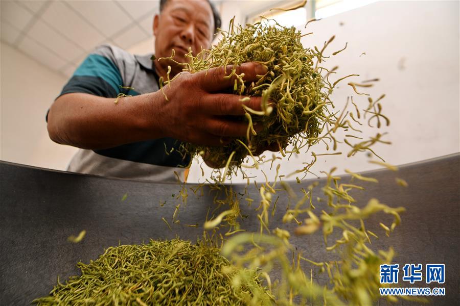 6月8日,河北省巨鹿县小吕寨镇西孟庄村农民在采摘金银花。近年来,河北省巨鹿县依托当地悠久的金银花种植历史,把金银花产业作为脱贫攻坚的重要手段。目前,巨鹿县金银花种植面积达13万亩,年产值12亿元,涉及4万多农户,金银花产业已成为当地农民脱贫增收的重要途径。新华社记者 牟宇 摄