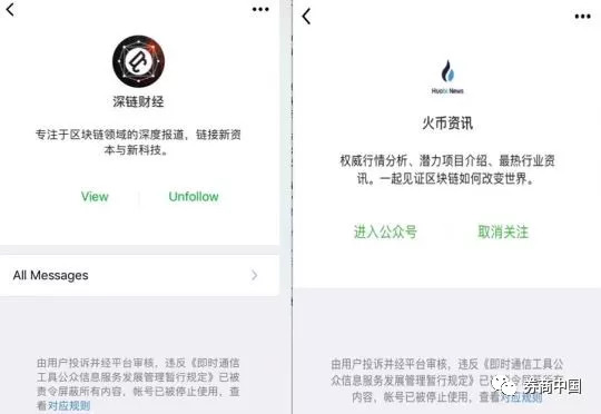 8月21日晚间,一批涉区块链微信大号被封,其中包括深链财经、金色财经、火币资讯、大炮评级、币世界快讯服务、每日币读、TokenClub、吴解区块链等。打开相关微信公众号页面显示:由用户投诉并经平台审核,违反《即时通讯工具公众信息服务发展管理暂行规定》已被责令屏蔽所有内容,账号已停止使用。