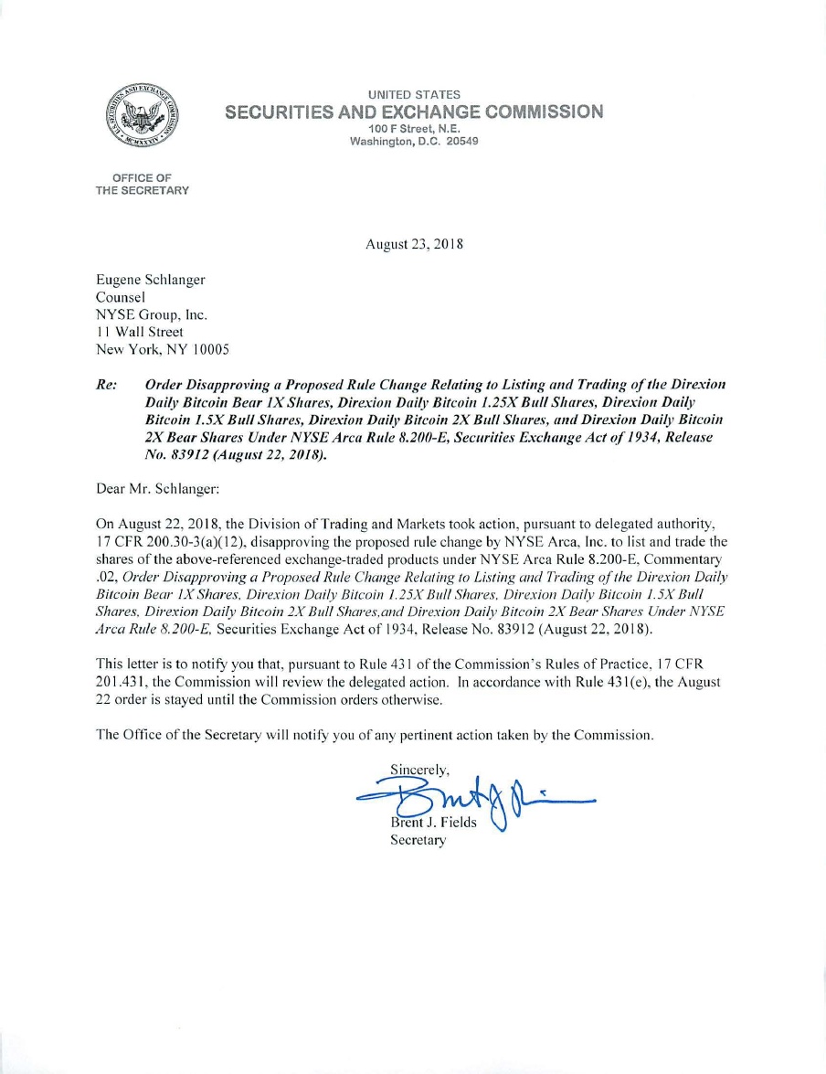 美国证券交易委员会秘书长Brent Fields在写给纽约证券交易所集团高级律师David De Gregorio的信中写道: