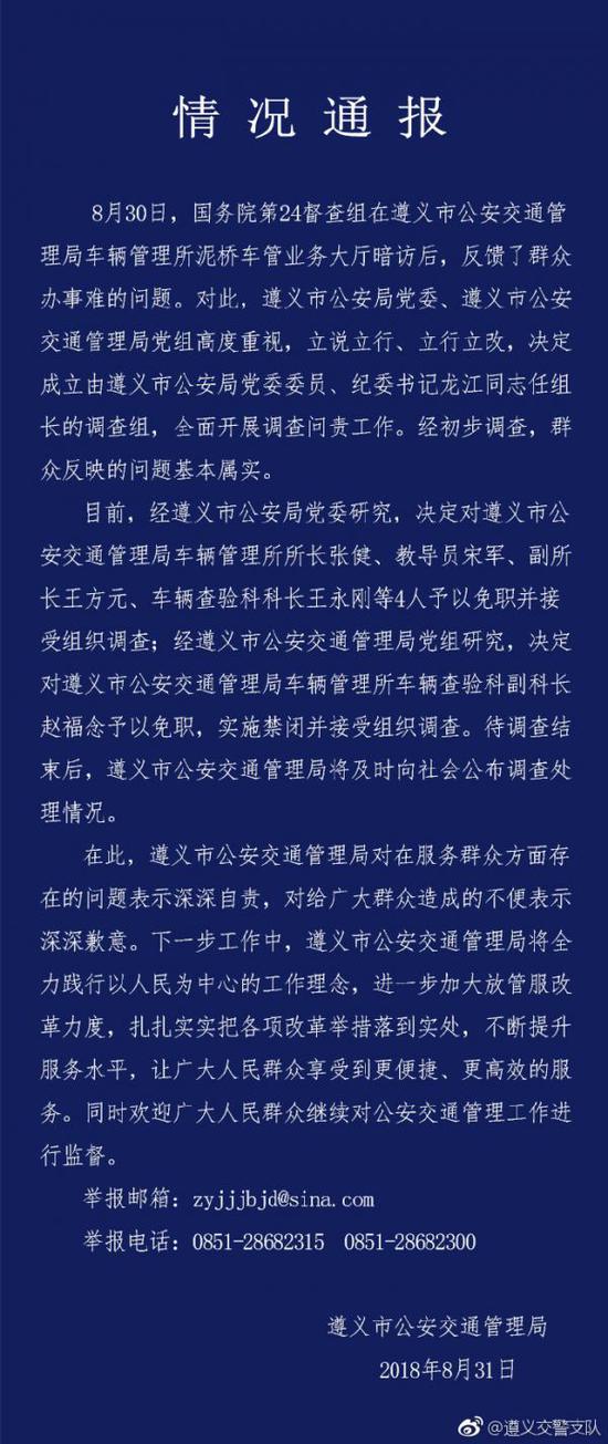 新华社昨天发布报道,称国务院督查组暗访遵义市车管所,发现有的排队四五天,有的要掏一两千找“黑中介”才能办下合格证。今天,遵义交警支队发布通报,车辆管理所所长张健,教导员宋军、副所长王方元、车辆查验科科长王永刚、车辆查验科副科长赵福念等人被免职并接受调查。
