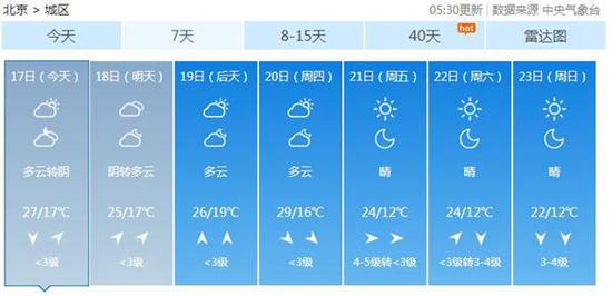 预计北京今天(17日)天气晴好,最高温27℃;明天转阴,南部有零星小雨,最高温25℃。后天起直到中秋小长假都是晴好天气,总体适宜出游,只是气温有些起伏,秋凉愈发明显。