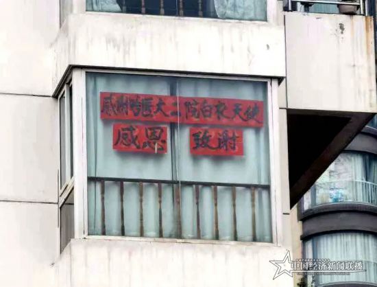驻地对面的居民楼上写着“感谢哈医大二院白衣天使”几个大字;