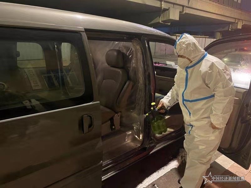 疫情应急转运队驾驶员栾玉先交班前对车辆进行消杀