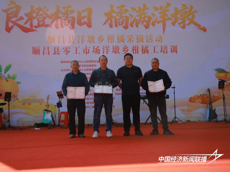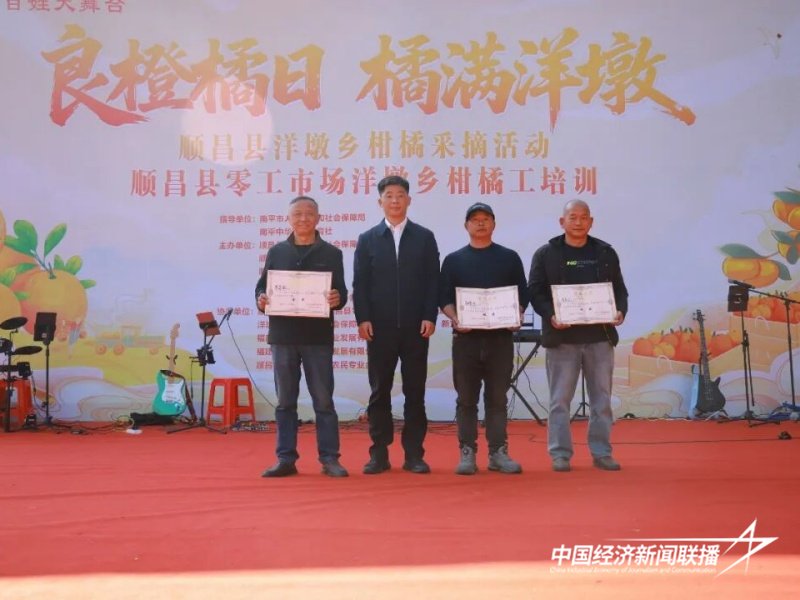 活动还为在洋墩乡2025年优质果评选中获奖的6位果农颁发证书,并举行了顺昌柑橘工授技启航仪式,为柑橘工代表颁发“柑橘种植技能培训礼包”。