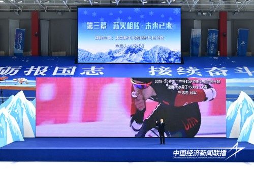 第一幕“根植黑土 叩问时代”,由哈体院教师卢佳怡主讲,以“历史的呼唤——罗致焕篇”为主题,通过饱含深情的讲述,再现了我国首位冬季项目世界冠军罗致焕从黑土地贫苦少年成长为世界冠军的奋斗历程,展现老一辈冰雪人矢志不渝的求索精神。罗致焕老前辈亲临现场,寄语师生“要像运动员冲刺一样奋勇前进,为实现中华民族伟大复兴的中国梦而奋斗”。冬季奥林匹克学院教师杨春媛作为学生代表献花致敬,哈体院速滑队与七台河短道速滑学校运动员联袂呈现了精湛的速度滑冰表演《一起向未来》,展现冰雪精神的代际传承。