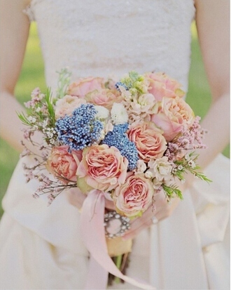 手捧花给人一种唯美、高雅、精美的感受。粉色的蔷薇花调配蓝色的浆果显得格外温馨,虽然在花朵的数量上有点多,可是全体的色彩仍是很调和的,很合适户外的草坪婚礼!