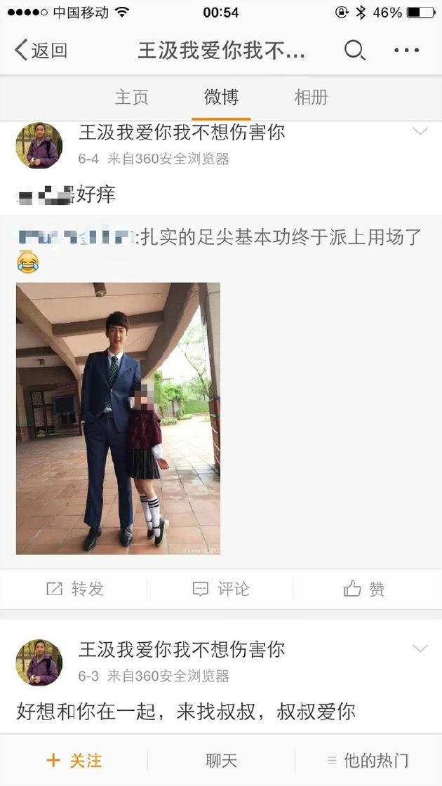 近期,有网友举报称,微博名为“王汲我爱你我不想伤害你”的人经常在女童星微博下留言,言语污秽、不堪入目,性挑逗意向明确。据悉,该人是一名31岁男子,姓孙,曾经公开起诉过童星林妙可,理由是自己曾在林妙可微博上多次留言,但始终未得到回复。他认为林妙可的行为侵犯了其人格尊严和身心健康,起诉索赔。
