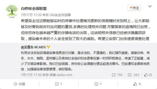 吴尊友说:“感谢白桦、肖冬、木木、晓刚、孟林等以及各地社会组织和志愿者在第一时间积极响应,传递了正能量,减少了对感染者影响。我们已经报案,将协助公安调查处理这起违法事件。已经通知全国各地疾控,加强感染者信息管理,做好服务。”