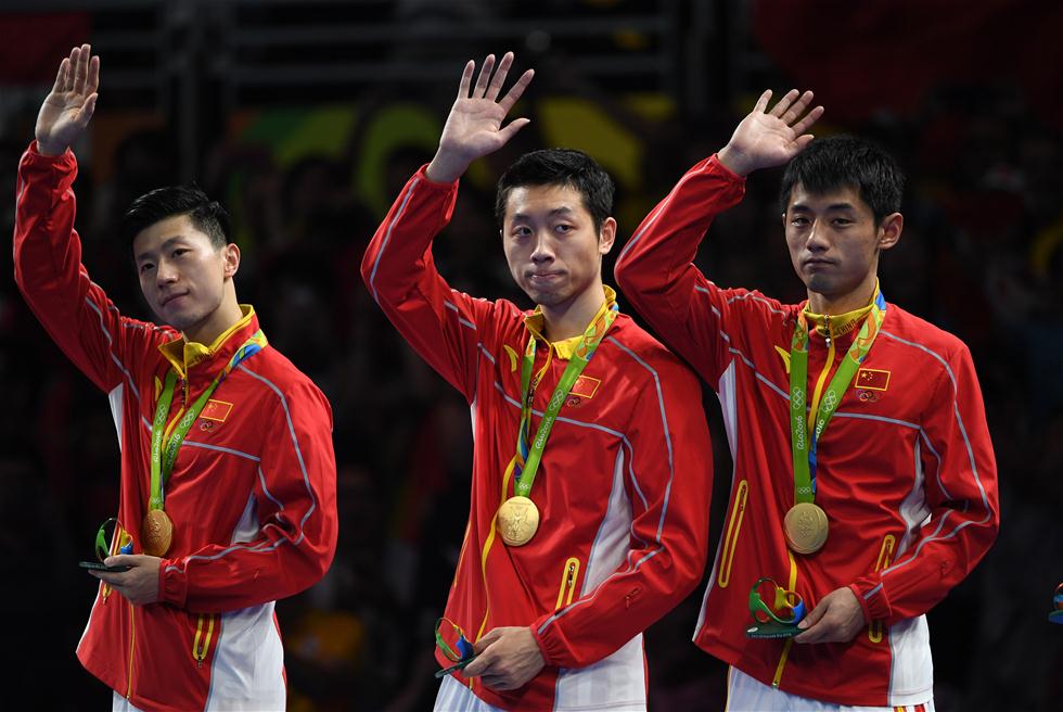 中国乒乓球选手马龙、许昕和张继科(从左至右)在男子团体赛中夺得金牌