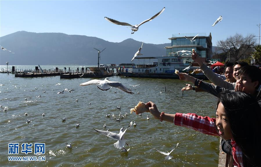 红嘴鸥在滇池上空飞翔(2月5日摄)。别了,劣V类!戴着这顶帽子31年的昆明滇池,2016年打了一个翻身仗:全年水质首次由劣V类提升为V类。一字之变,价值不凡。专家认为,这是滇池治理的里程碑进展,也是我国环境保护和水污染治理的标志性成果。黯然失色多年的“高原明珠”,逐渐重新焕发昔日神采! 新华社记者 蔺以光 摄