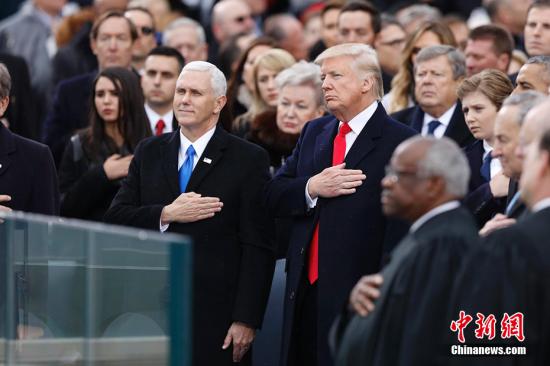 资料图:当地时间1月20日,美国新任总统就职典礼在华盛顿哥伦比亚特区举行。特朗普在国会大厦宣誓就职,正式成为第45任美国总统。图为特朗普和彭斯在典礼上。 中新社记者廖攀摄
