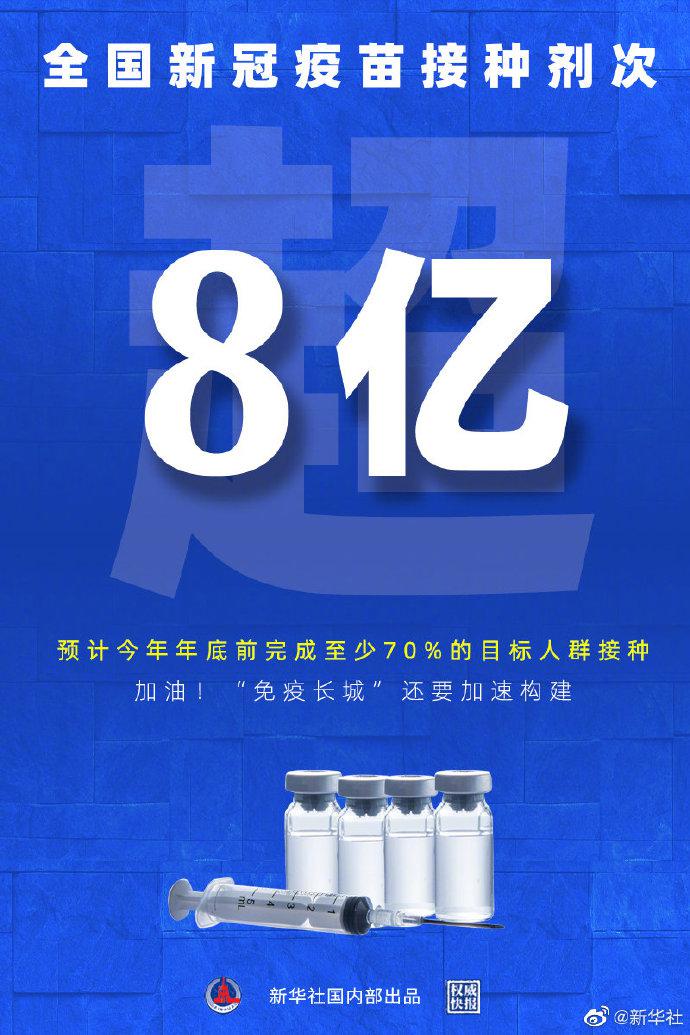 国家卫健委6月9日通报,全国新冠疫苗接种已超过8亿剂次,免疫屏障正在加速构建。国家卫健委负责人近日接受新华社记者专访时表示,预计年底前至少70%目标人群接种疫苗。共筑“免疫长城”,我们还要继续努力。