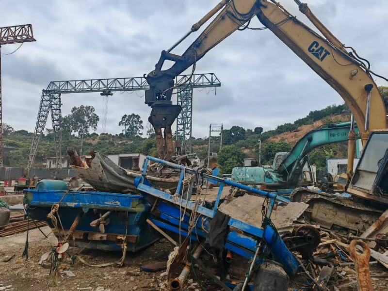随着挖掘机“挥拳”重重砸向涉渔“三无”船舶,一艘艘木质、玻璃钢“三无”船舶,伴随着“折断声”“撕裂声”瞬间被肢解压碎,铁制“三无”船舶驾驶台、龙骨、主机等设备设施被逐一切割或破坏。为杜绝“船舶残体”再次流入市场用于非法作业,委托第三方监理单位对整个拆解过程进行现场监督,并对每艘“三无”船舶的拆解过程进行拍照记录,确保“三无”船舶全部拆解销毁。
