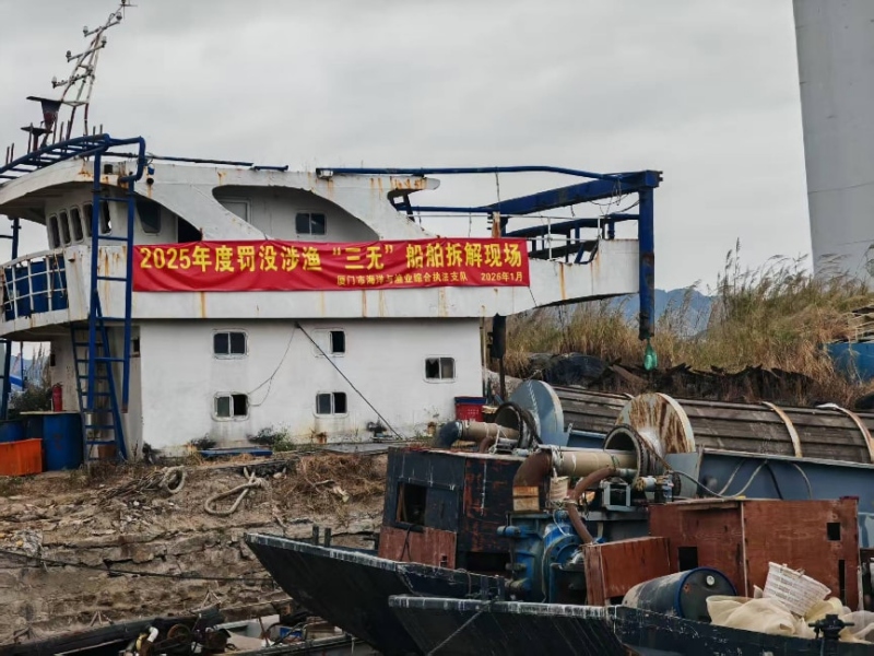中经联播讯(马海彤 通讯员 王俊)为严厉打击涉渔违法违规行为,坚决斩断非法捕捞利益链条,切实维护辖区渔业生产秩序、守护海洋生态安全,近日,厦门市海洋与渔业综合执法支队组织开展2025年度罚没涉渔“三无”船舶现场拆解活动,共拆解涉渔“三无”船舶33艘,以刚性执法彰显整治“三无”船舶的坚定决心。