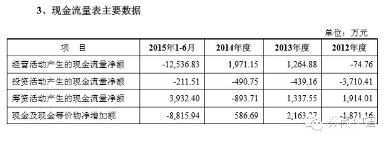 其次,万集科技披露的招股说明书摘要显示,该公司现金流量表主要数据并不漂亮,尤其是2015年1-6月的数据尤为“刺眼”。经营活动产生的现金流量净额、投资活动产生的现金流量净额、筹资活动产生的现金流量净额、现金及现金等价物净增加额四个数据中,三个数据均为负数,仅筹资活动产生的现金流量净额为正值。