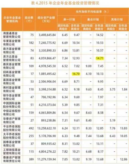 就具体的投资管理公司来看,目前共有20家金融机构拥有企业年金的投资管理资格,其中基金公司共有11家,券商和保险公司合计共9家。就投资收益率来看,在单一计划的权益类产品中,招商基金获取16.7%年度加权平均收益率,排名第一;在集合计划的权益类产品中,易方达基金以14.71%的收益率位居榜首。
