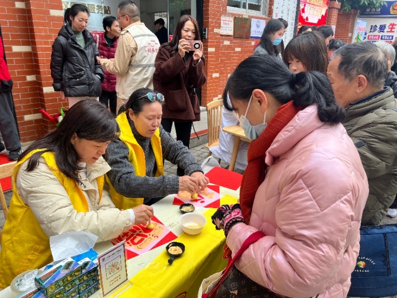 与笔墨书香相映成趣的,是拓印金色福字区域的热闹景象。长长的队伍中,既有活泼的孩童,也有白发苍苍的老人。区慈善总会工作人员提前备齐精致雕版、醇厚金墨与喜庆红宣纸,耐心指导居民体验传统拓印技艺:手持海绵棒均匀上墨,对准雕版轻轻按压,待金色“福”字在红纸上缓缓浮现、愈发清晰,现场便响起阵阵由衷的赞叹。“亲手拓的福字更有意义,既能感受老手艺的魅力,又能把福气带回家!”刚完成拓印的社区居民王阿姨捧着作品,脸上满是自豪与喜悦,志愿者们全程陪伴协助,让每一位参与者都能沉浸式感受传统文化的温度。