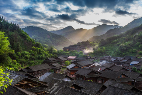 只见远处青黛色的山峦缠绕,几户早起的人家屋顶升起袅袅炊烟,芋头侗寨躺在满目清新的山谷中,显得格外静谧安详。此情此景,脑海中很自然地回响起周董那首《青花瓷》的旋律来——“天青色等烟雨,而我在等你……”