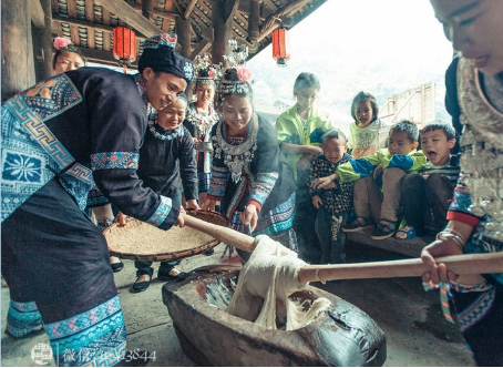 侗族喜食糯。糯米是寨子里最有魅力的食物,将蒸好的糯米放入石舂中,用长槌反复击打,直到米筋弹黏成为整体,然后将打好的巨大糯米团捏成小圆块,裹上豆面或糖粉,就是美味可口的糍粑了。郎有情妹有意的侗家阿哥阿妹,一边悠闲的打着糍粑一边诉说着情怀,那份美妙羡煞多少旁人。