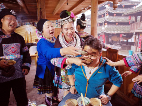 寨前下车,穿过载歌载舞、夹道欢迎的芦笙队伍,来到一排拦路的美丽姑娘面前,她们每人手捧一碗自家酿造的糯米酒,一边唱歌,一边将酒碗端到每位客人面前,客人们只有顺从地喝下姑娘手中的美酒才会被准许放入寨子。否则……姑娘就会一直不停地唱下去,直到每一位客人都接过酒碗“咕咚...咕咚...”地把酒喝下去。