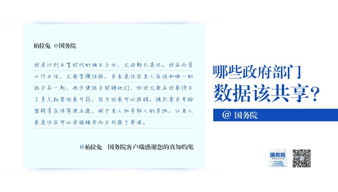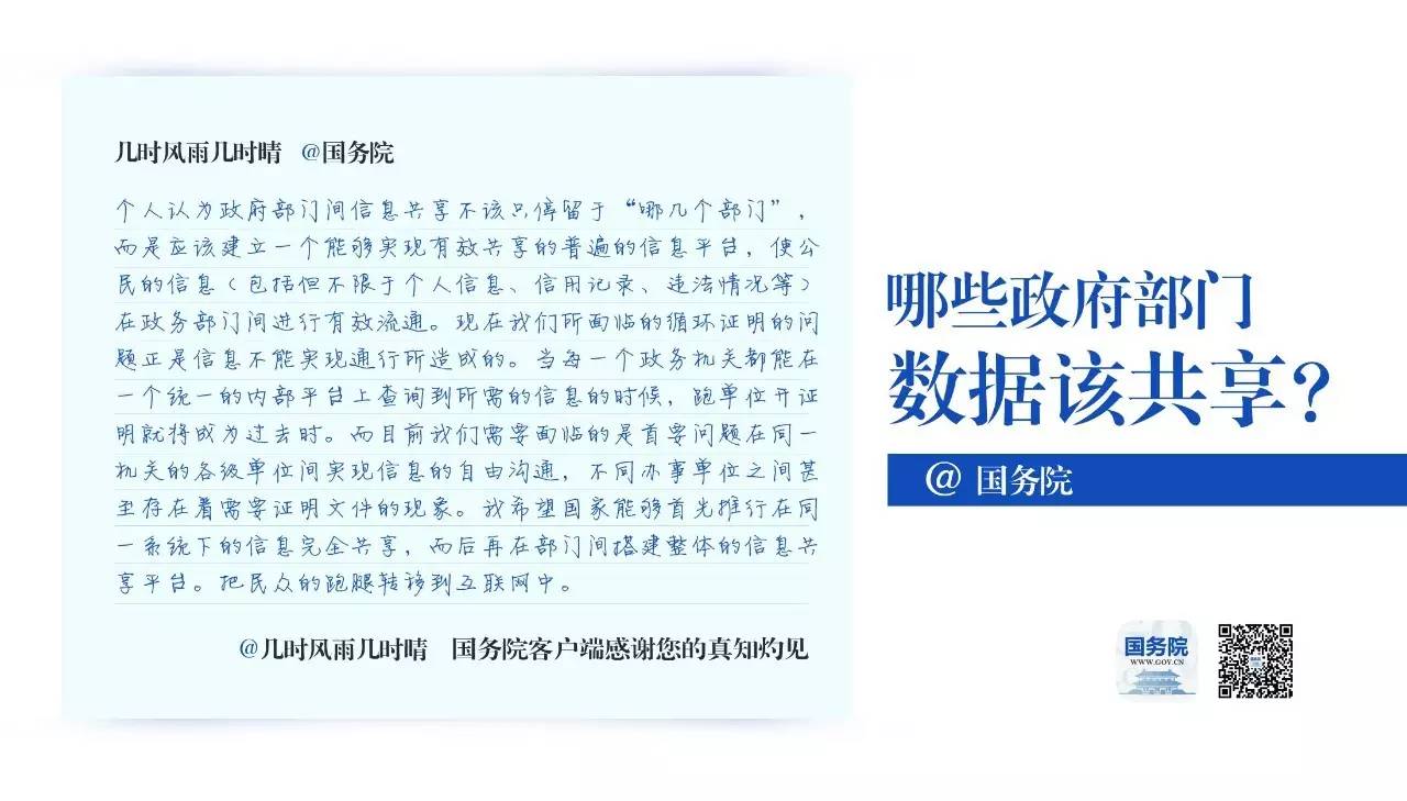 我希望国家能够首先推行在同一系统下的信息完全共享,而后再在部门间搭建整体的信息共享平台。 把民众的跑腿转移到互联网中。