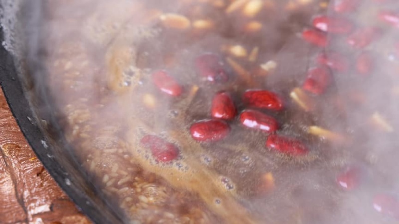 清晨的虎渡村常春岩广场,暖意融融,几口大桶锅冒着腾腾热气,红枣、桂圆、花生、香菇等多种食材熬制的腊八粥香气四溢,村民们捧着一碗碗热气腾腾的粥品细细品尝,氤氲热气中映照着一张张幸福的笑脸。