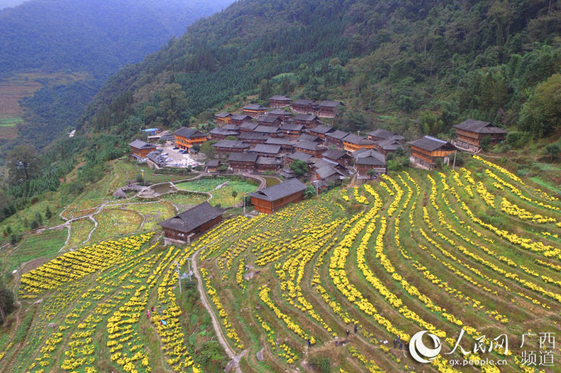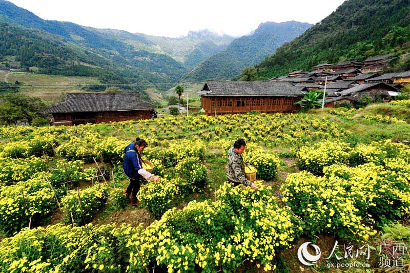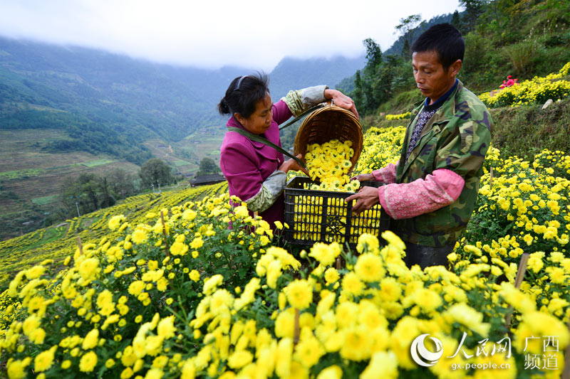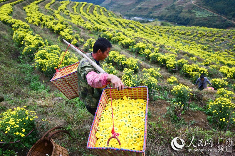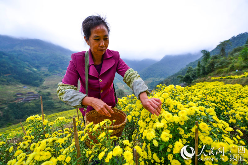 人民网龙胜11月3日电 11月2日,广西桂林市龙胜各族自治县泗水乡周家村白面瑶寨的瑶族群众在采摘皇菊。日前,广西桂林市龙胜各族自治县泗水乡周家村白面瑶寨的皇菊进入盛花期,当地瑶族群众抢抓晴好天气采摘皇菊供应市场需求。