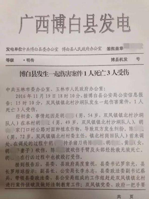 11月19日下午,广西壮族自治区玉林市博白县发生一起持刀伤人事件。知情人士提供的博白县政府的通报材料显示,双凤镇镇北村沙垌队的伤害案件发生在19日15时10分,致1人死亡3人受伤。