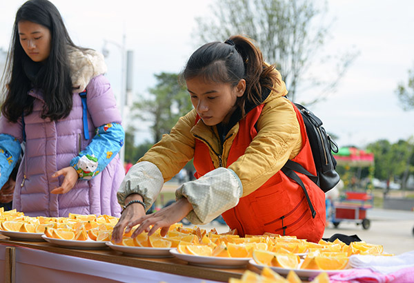 11月26日,商家在活动现场摆放脐橙请游客品尝。