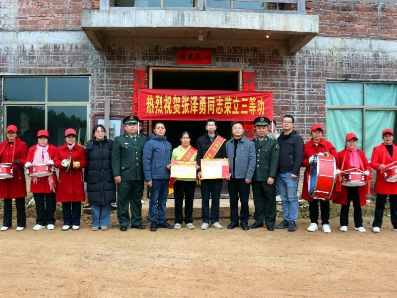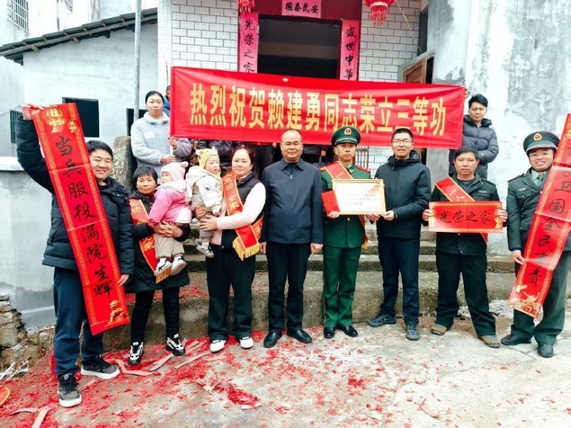 新年添喜韵,喜报送荣光。1月23日,县退役军人事务局联合馆前镇党委、政府及汀东村两委组成的送喜报队伍,带着沉甸甸的荣誉与真挚祝福,为现役军人赖建勇家庭送上荣立三等功的喜报,让“一人立功、全家光荣”的喜悦传遍全村街巷。赖建勇,2009年12月入伍,现为武警江西总队机动支队某中队狙击步枪手,先后荣立个人三等功2次、班三等功1次、四有优秀士兵4次、嘉奖6次。在2025年战备训练工作中,始终坚持以战为练、以练促战,切实履行岗位职责,充分发挥骨干带头作用,在二0二五年度战备训练工作中成绩突出,荣立三等功。