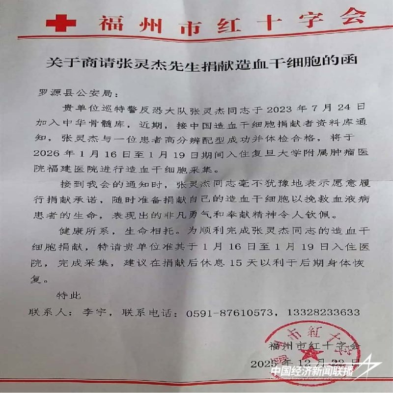 时间回溯到2023年7月24日,张灵杰怀着对生命的敬畏,自愿加入中华骨髓库,许下无声的“生命之约”。近日,他接到福州市红十字会通知,与一名血液病患者造血干细胞高分辨配型成功,且体检指标达标,一场生命接力即将启动。