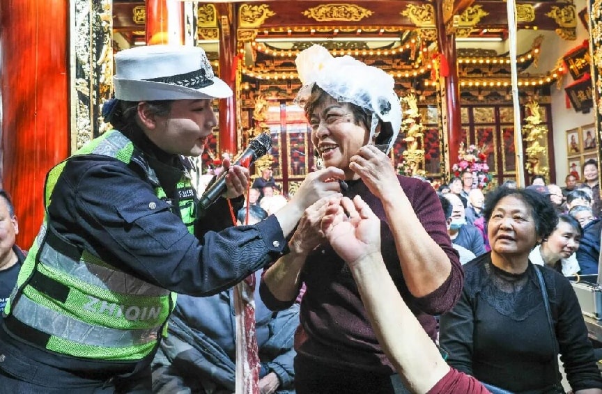 “本来只是来听曲儿的,结果学了安全知识,还领到礼品”“交警妹子太会了,说的全是咱老百姓的大白话,听得懂、记得住”“福安交警懂宣传,礼品送到咱老百姓心坎上”…… 。台下阿公阿婆边看边学,连连点赞,脸上满是笑意。没有生硬的说教,只有接地气的互动;没有距离感的宣讲,只有心贴心的交流,烟火气里焐热的宣传,走进了乡亲们的家门,住进了大家的心门。